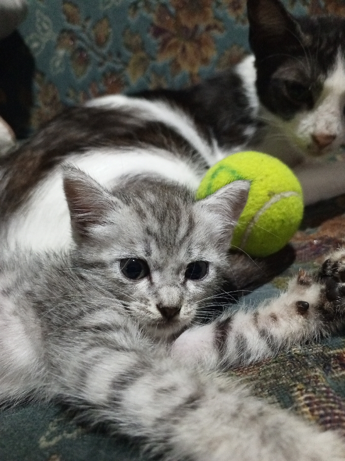 The image depicts an indoor scene in Viengkham, Laos, featuring two felines and a tennis ball on patterned fabric. In the foreground, a young kitten with grey tabby markings and dark eyes lies partially on its back, looking directly towards the viewer. Its front paws are slightly splayed, revealing lighter fur on the undersides. Directly behind the kitten, slightly out of focus, rests an adult cat with black and white fur, its head visible to the right. Its eyes are partially closed or cast downwards. A neon yellow tennis ball is positioned between the two cats, near the kitten's head and the adult cat's body. The felines are situated on a surface covered with a dark green or teal patterned fabric, featuring interwoven designs and, in the background, a floral motif with brown and orange elements.
