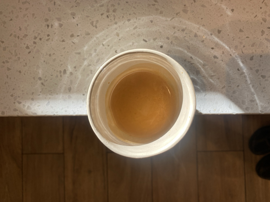 - "A top-down, slightly oblique view captures a single white disposable-style cup containing a light brown liquid, consistent with coffee or tea, resting on a speckled light-colored countertop" by FM-Xeesl1, licensed under CC BY 4.0
