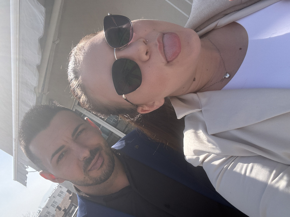 A selfie-style photograph captures two adult individuals outdoors in an urban environment of Plovdiv, Bulgaria. The scene is brightly illuminated by direct sunlight, indicating a clear sky. In the foreground, slightly to the right, is a female subject facing the camera. She has dark hair, which appears pulled back, and wears dark-lensed, gold-framed sunglasses. A small silver-colored piercing is visible in her left nostril. Her mouth is open, with her tongue extended in a playful gesture. She is dressed in a light-colored (possibly beige or off-white) blazer over a white top, with a thin, silver-colored chain necklace featuring a single clear gemstone pendant visible around her neck. A small, dark mark is present on her lower left neck. Partially obscured behind and to the left of the female subject is a male subject. He has short dark hair, a trimmed beard, and prominent dark eyebrows. He looks directly at the camera with a neutral expression. He is wearing a dark blue blazer over a black collared shirt. The background shows parts of a light-colored building with a white retractable fabric awning extended overhead. Further in the distance, indistinct light-colored urban buildings are visible against the bright sky, suggesting an elevated viewpoint, such as a balcony or rooftop.