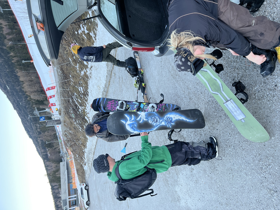This image captures a winter scene at a ski resort parking area in the mountainous region surrounding Innsbruck, Austria. The foreground depicts a group of four individuals, three males and one female, engaged in preparing for or concluding a snowboarding and skiing session. To the left, a male in a black knit beanie, sunglasses, green hoodie, and dark cargo pants with a black backpack is holding a black snowboard vertically. The snowboard features a prominent blue and white ghost-like graphic. He is holding a light blue tool, possibly a scraper, near the board. Adjacent to him, a second male with dark, curly hair, wearing a dark jacket, smiles down while holding another snowboard upright. This board displays a vibrant purple graphic with text that appears to read "ARBA SAID." In the middle ground, a third male, wearing a yellow beanie and a dark blue jacket with a white graphic on its back, stands near the open trunk of a silver/grey station wagon. He appears to be interacting with items inside or near the car. On the ground behind him, a black duffel bag and a pair of skis with bindings are visible. In the right foreground, a female with blonde hair, wearing a black and white patterned beanie, a black jacket, and dark brown ski pants, is crouched down. She is adjusting her right snowboard boot or binding on a light green snowboard, which has a distinct grey exhaust pipe graphic. The environment consists of a partially snow-covered asphalt parking lot. In the background, a groomed ski slope with orange and white safety netting ascends a snow-covered hill. Several ski lift pylons are visible against a backdrop of dense evergreen forests covering a steep mountain. A blue "P" parking sign with an arrow is also discernible in the background. A white SUV is parked further in the distance. The sky is clear, suggesting daylight conditions.