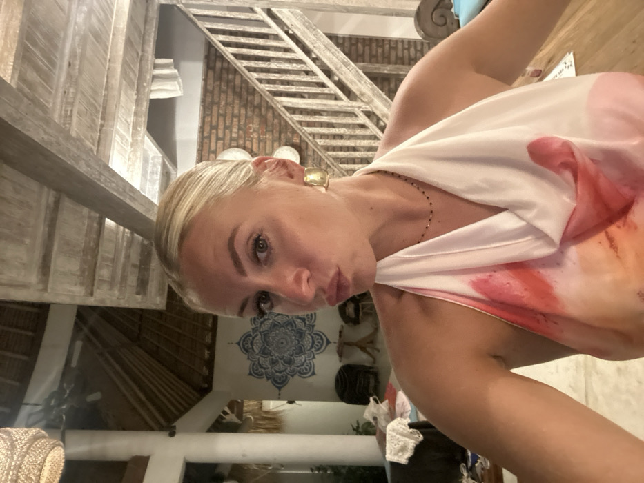 The image captures a blonde female subject in an indoor residential or resort setting in Pecatu, Indonesia