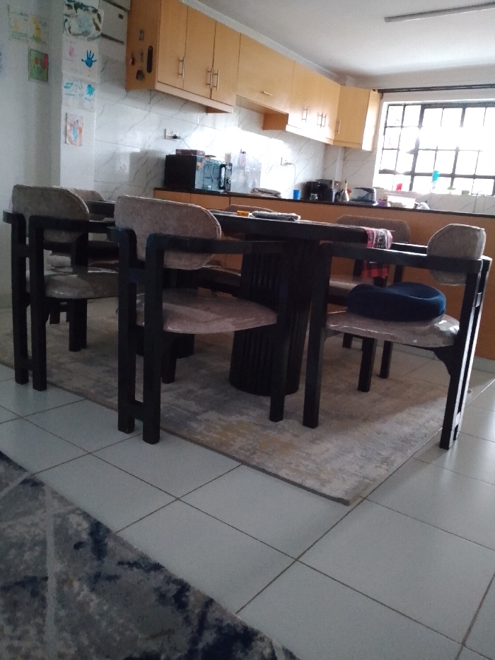 The image depicts an indoor dining and kitchen area located within Olkeri ward, Kenya. In the foreground, a dark-colored rectangular dining table with a ribbed, cylindrical pedestal base is positioned on a rectangular rug featuring a mottled pattern in shades of grey, beige, and light blue. Surrounding the table are at least four dining chairs with dark frames and light beige upholstered seats and backs, each seat covered with clear plastic protective sheeting. A dark blue cushion rests on the plastic-covered seat of the chair on the far right. The floor consists of light grey or white tiles with visible grout lines. The background reveals a kitchen area with a dark countertop and a white tiled backsplash exhibiting grey veining. Above the countertop, a series of light-colored wooden wall cabinets with silver-toned handles are installed. Various kitchen appliances and items are visible on the countertop, including a dark microwave or oven, a blender or coffee maker, and other containers. A large window with multiple dark panes is present on the far right wall, through which bright natural light enters. A light blue object rests on the windowsill. The ceiling is white, with a linear light fixture visible. No individuals are present in the scene, and no explicit actions or interactions are depicted. The overall environment appears clean and organized.