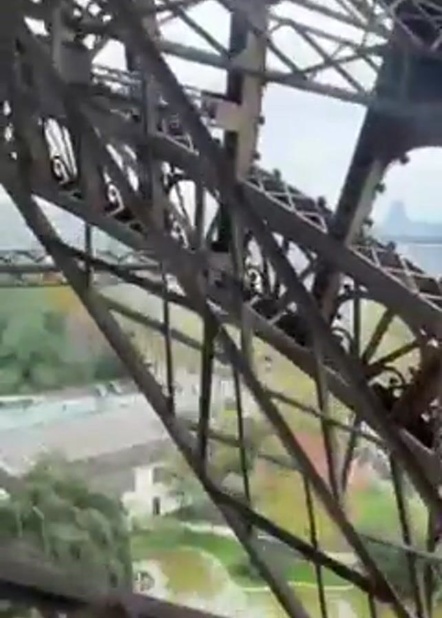 view from inside the Eiffel Tower in Paris. The camera is angled upward, capturing the intricate metal lattice structure of the tower. Through the structure, we can see the ground below, including green spaces, roads, and buildings. The overall impression is one of height and perspective, as the viewer is positioned high within the tower, looking down at the city. There are a few snippets of conversation in the background.