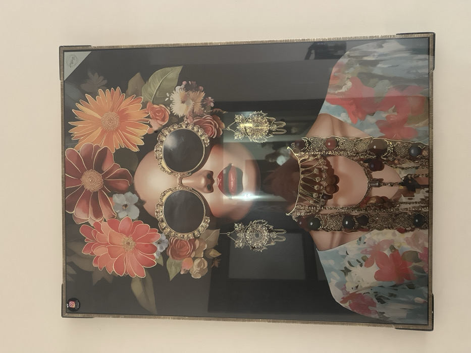 A large, rectangular art print, vertically oriented and enclosed in a dark-toned frame, is mounted on a plain, light-colored wall. The scene is located in the city of Razgrad, Bulgaria. The print depicts a stylized female portrait from the chest up. The subject wears a substantial floral crown featuring prominent red, orange, and blue flowers, set against a dark background. Her face is largely concealed by oversized, round, gold-rimmed sunglasses with dark lenses. Red lipstick is visible on her slightly parted lips. She is accessorized with large, intricate gold dangle earrings and multiple layered necklaces composed of gold-toned chains, dark beads, and reddish-brown elements. Her attire includes a light-colored garment with a soft floral pattern. Reflections on the print's protective surface, notably a strong vertical glare and faint images of individuals and the surrounding room, partially obscure the artwork. Small branded identifiers, including an Instagram logo, are visible in the upper left corner of the print.