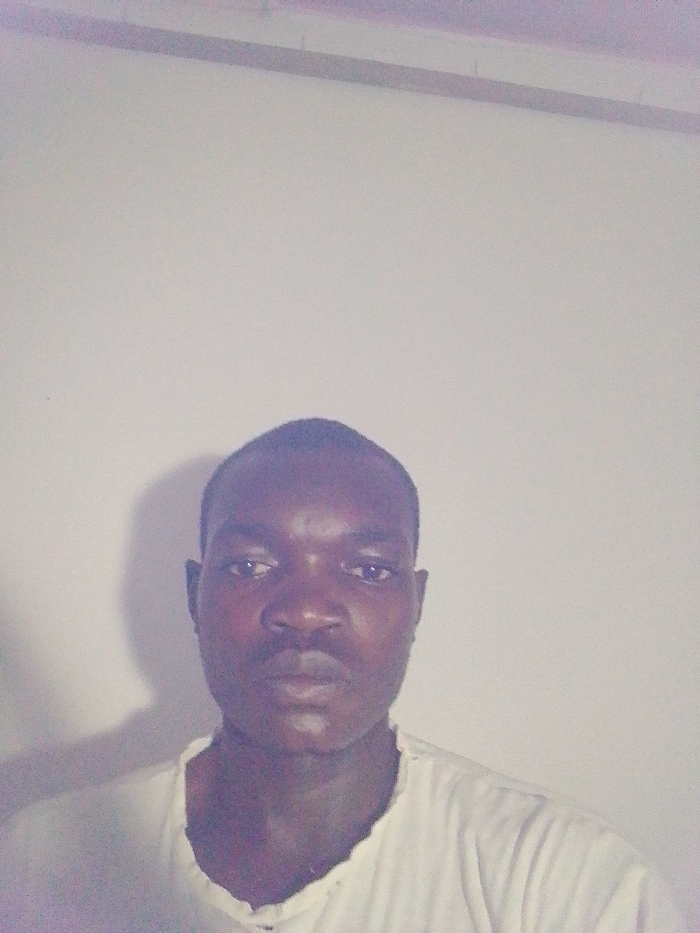 The image displays a close-up, frontal view of an adult male in an indoor environment, located in the city of Unknown, Unknown. The subject is an individual with dark skin, short dark hair, and dark eyes, looking directly into the camera with a neutral expression. He is wearing a light-colored, possibly white, garment that appears to be a t-shirt, featuring a somewhat irregular or distressed neckline. The background consists of a plain, light-toned wall with minimal discernible features, though a faint horizontal line or subtle discoloration is visible in the upper portion of the frame. The lighting appears to be from the subject's right, casting a soft shadow on his left side. No other individuals, actions, interactions, or prominent objects are visible in the scene.