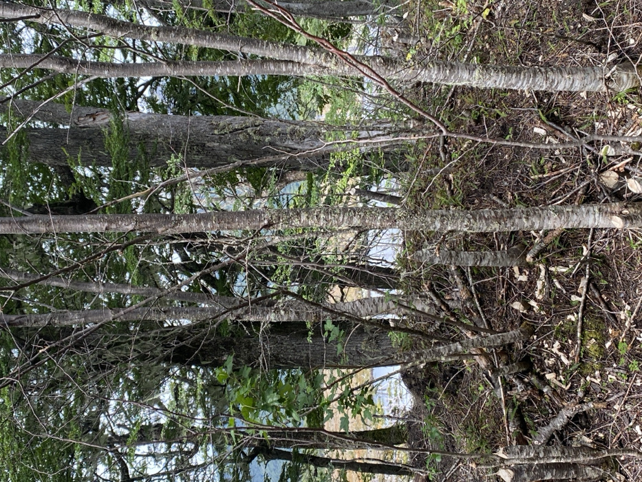 A dense woodland scene, shot from a low angle. Thin, light-barked trees dominate, their branches intertwining across the frame. Some greenery peeps through, with glimpses of water or sky in the background. The forest floor is cluttered with dead branches, leaves, and small undergrowth, creating a natural, undisturbed feel.