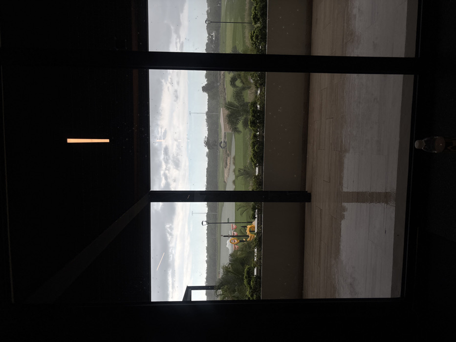 The image displays an exterior view through a large, multi-pane glass window from an indoor vantage point. The indoor ceiling is dark, featuring a single, vertically oriented, amber-glowing rectangular light fixture in the upper center. A small, transparent plastic bottle with a white screw cap is visible on the interior floor, centrally positioned at the bottom edge of the frame, in front of the glass. Outside, a light-colored, horizontally tiled patio floor is visibly wet, reflecting the overcast sky and interior light, indicating recent or ongoing rain. Water droplets are present on the window's exterior surface. Beyond the patio, a low, light-colored concrete wall supports a line of dense green shrubs and tropical palm fronds. The background reveals a large golf course located in Komchén, Mexico, under an overcast sky with significant gray cloud cover. A body of water, possibly a lake or pond, separates the foreground patio from the main golf course fairways. Multiple tall, dark lampposts or light poles are distributed across the golf course. On the far side of the water, a prominent yellow structure, possibly an inflatable or decorative representation of construction machinery such as a backhoe, is situated, flanked by red and white striped markers or barriers. Further right on the golf course, a large, dark, circular sculpture or structure is discernible. The distant horizon consists of a dense treeline. No human figures or animals are present in the scene.