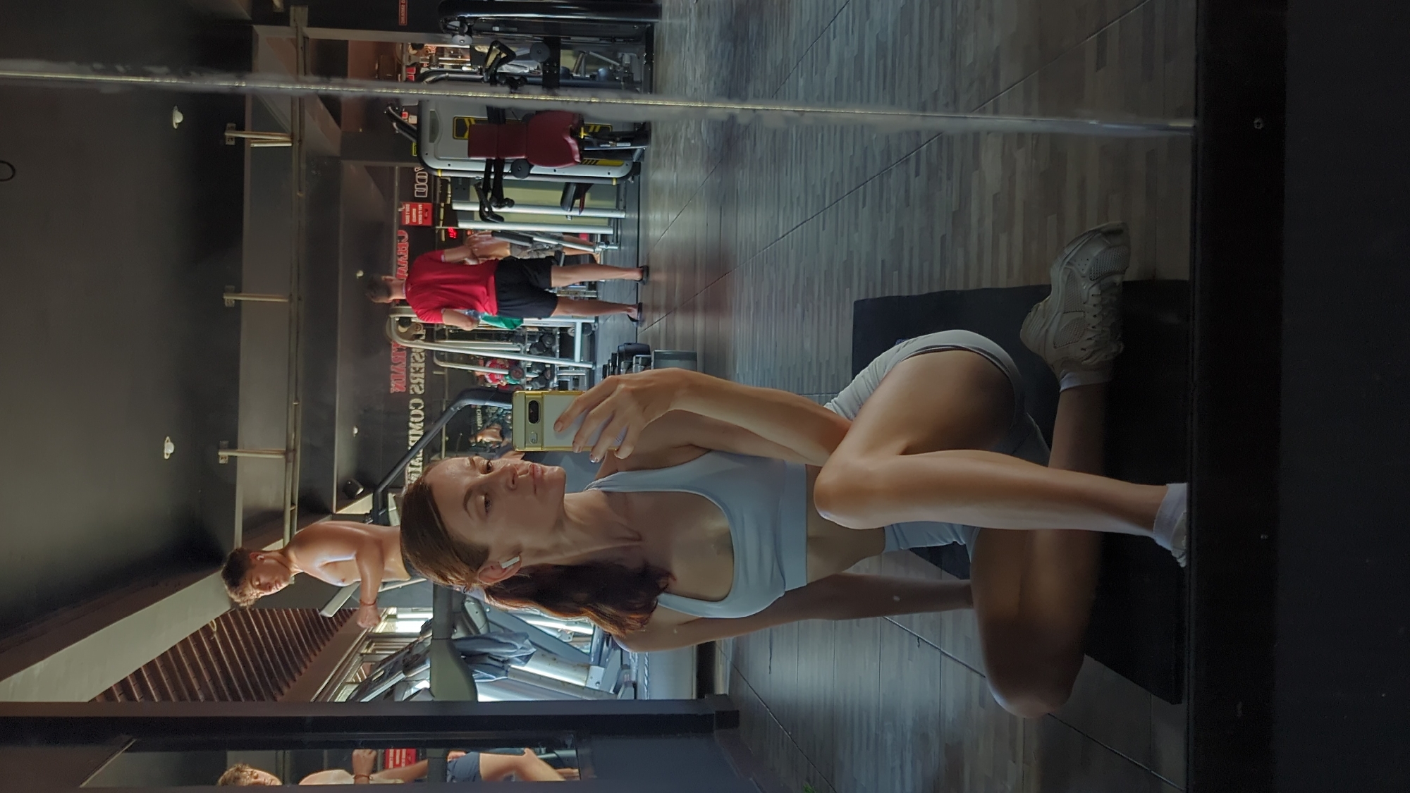 Here's a forensic description of the image: **Location:** Gym in Pererenan, Bali, Indonesia. **People:** * A woman (presumably taking the photo), wearing a light blue sports bra and light grey shorts, with white sneakers and socks, holding a cell phone. * In the background, at least three other individuals: one shirtless man working out on a machine, one man in a red shirt and black shorts, and one unidentified person at a treadmill in the lower left corner of the reflection. **Objects:** * Gym equipment (various weight machines, treadmills). * A black yoga mat. * A cell phone (presumed to be the phone taking the photo). * A mirror reflecting the gym environment. **Actions:** * The woman is taking a selfie in a gym mirror. * Other individuals are working out in the gym. **Environment:** * A modern gym with dark ceilings and light-colored tile or laminate flooring. * The gym has standard fitness equipment arranged in rows. **Interactions:** * The woman is interacting with her cell phone to capture the selfie. * The other individuals in the gym are working out individually.