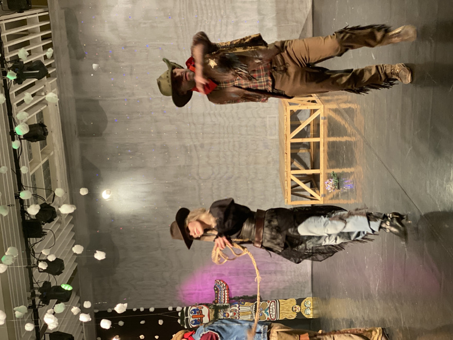 This image captures an indoor theatrical stage performance or rehearsal in Ust-Ilimsk, Russia. The scene features three individuals on a dark, reflective stage floor, illuminated by stage lighting, with various props and decorations. The central figure, a woman positioned left of center, wears a brown cowboy hat, a black long-sleeved top, a dark wide belt, a black sheer overskirt, light-colored pants, and black ankle boots with heels and decorative straps. She holds a coiled rope in both hands and looks slightly to her right with a faint smile. To her right, a man wears an olive-green cowboy hat, a red bandana around his neck, a plaid shirt, a brown fringed vest with a sheriff's badge, and brown fringed pants with light-colored shoes. He is captured in a dynamic pose, gesturing with his right hand, and looking towards the left. On the far left, a third individual is partially visible, wearing a light blue denim jacket, khaki pants, and light brown footwear. The stage background consists of a light grey textured surface, subtly sparkling. A localized pink light illuminates the backdrop behind the woman. On the far left, a tall, multi-colored totem pole-like prop stands next to a black fabric hanging adorned with white circular shapes. A low, rectangular wooden platform is positioned mid-ground, right of center. A small, multicolored decorative object rests on the floor near the wooden platform. Overhead, a grid of stage lights and rigging is visible, with numerous white, spherical or cloud-like ornaments suspended, some emitting a green glow.