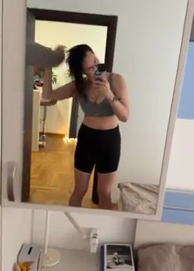 A woman stands in front of a mirror, taking a selfie with her phone. She is wearing a gray sports bra and black shorts, and her hair is wet and hanging loose. She is using a gray towel to dry her hair. The mirror is mounted on a white cabinet, and a desk with a lamp and books is visible below the mirror. The room appears to be a bedroom, with a bed and wooden floors visible in the background. There is a glimpse of another room with a table and chairs through a doorway.