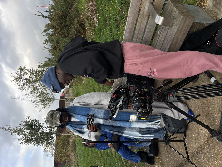 The image displays an outdoor video production scene under an overcast sky, likely within Hyde Park, London, a location indicated by "PABLO - Hyde Park Collection" branding on a scarf. Three individuals are present. In the left-center foreground, a person wearing a camouflage baseball cap, a light grey oversized hoodie, blue jeans, bright blue shoes, and a blue and white gradient fringed scarf, holds a black smartphone with a distinctive patterned case horizontally, focusing on its screen. Adjacent to them on the right, a second person, wearing a blue knitted beanie with sunglasses pushed up, a black hoodie, and pink sweatpants featuring a star-and-text embroidery, stands near a wooden park bench, looking towards the camera setup with a slight smile. A professional cinema camera, fitted with a matte box and external accessories, and bearing a yellow label on its lens housing, is mounted on a black tripod between these two individuals. A black hard case rests on the ground near the tripod. To the far left, a third, partially obscured individual is seated on the park bench, dressed in a blue tracksuit and large dark furry boots. The surrounding environment comprises paved ground, green grass, several young deciduous trees, and dense green bushes. Distant buildings and a white pole with a red banner are visible against the cloudy, grey sky.
