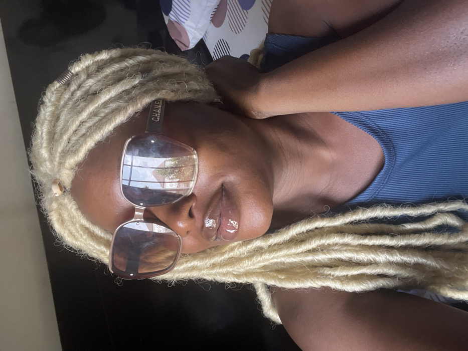 A dark-skinned female individual is depicted in a medium-shot, oriented slightly to her left, with natural light illuminating her from the front-right. She wears oversized, square-framed sunglasses with dark, reflective lenses, featuring "CHANEL" inscribed on the right temple. Her blonde faux locs are adorned with a light-colored cowrie shell near the front hairline on the viewer's left, and a metallic coiled ornament on a loc on the viewer's right. Her lips are glossy. She is dressed in a ribbed, dark teal sleeveless top. Her left hand is positioned behind her neck. The background is predominantly dark and out of focus, with a section of patterned bedding or pillow visible on the viewer's left, displaying white, light blue, and brown geometric shapes. The reflection in the sunglasses reveals an outdoor scene with a blue sky, buildings, and vegetation. This scene is situated in an interior setting within the city of Gwarinpa, Nigeria.