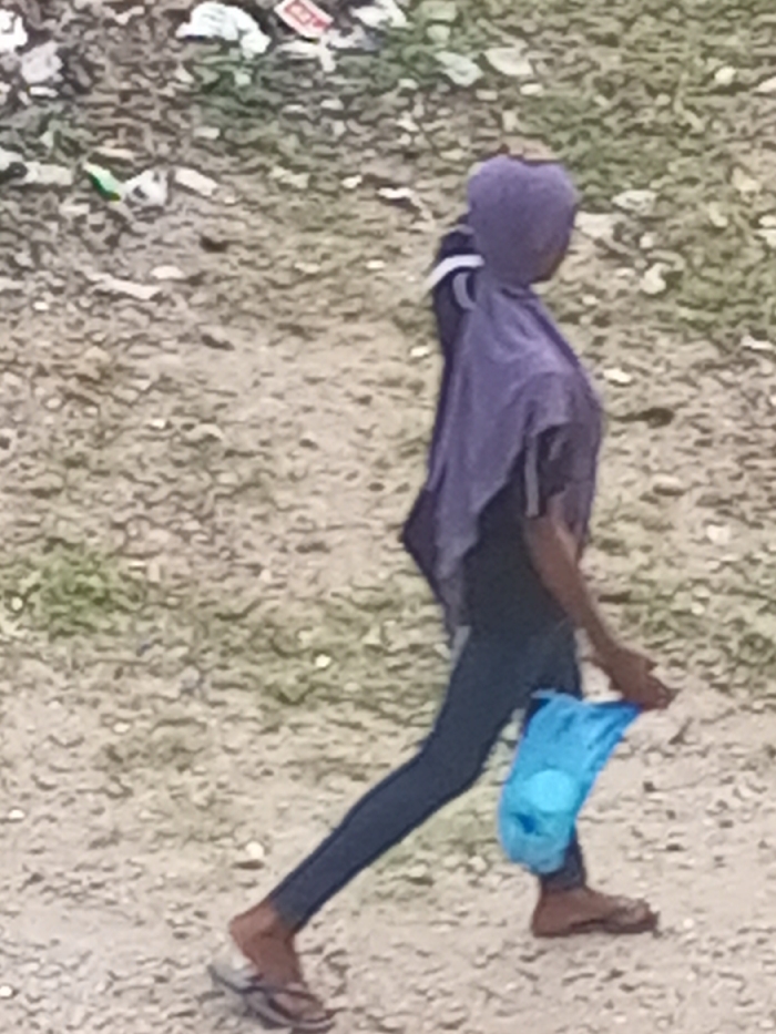 A single individual is captured walking from left to right across a dirt path in the city of Adankolo, Nigeria. The person wears a dark long-sleeved shirt, dark blue form-fitting pants or leggings, and a purple head covering draped over the head and shoulders. A white strap is visible over the right shoulder. Brown flip-flop style sandals are worn on both feet. The individual's right hand holds a light blue plastic bag at thigh level. The ground is composed of light brown soil mixed with sparse green vegetation, and various pieces of white and reddish debris are scattered in the background.