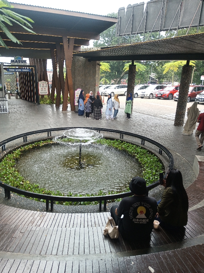 The image depicts an outdoor public space featuring a circular fountain and a covered entrance area. Signs visible at the entrance, reading "MASUK" (Enter) and "TAMAN WISATA EDUKASI" (Educational Tourist Park), are in Indonesian, contradicting the specified location of Tân Kỳ Commune, Vietnam. In the foreground, two individuals are seated on a slatted wooden bench structure, facing a circular fountain. The fountain has a central nozzle emitting a mushroom-shaped water spray and its basin contains water with green aquatic plants, surrounded by a black metal railing. The individual on the left wears a black t-shirt, black trousers, and a black cap, with a light-colored shoulder bag positioned beside them. The individual on the right has long dark hair, wears a dark jacket, and is holding a smartphone in a horizontal orientation, directed towards the fountain. In the midground, a group of approximately eight women stands on a patterned paved area beneath a large, dark-colored canopy roof supported by wooden and stone-clad pillars. Most women are wearing hijabs and various modest clothing in colors such as blue, orange, black, and light green. They appear to be gathered and conversing. To the right of this group, two other individuals are partially visible walking away; one wears a light-colored, full-length garment and a hijab, and the other wears a red top and light-colored trousers. The background shows a parking lot filled with numerous parked cars, predominantly white, red, and silver. Large stone-clad pillars and a substantial roof structure frame the entrance. Green trees and dense foliage are visible in the distant background and surrounding the perimeter.