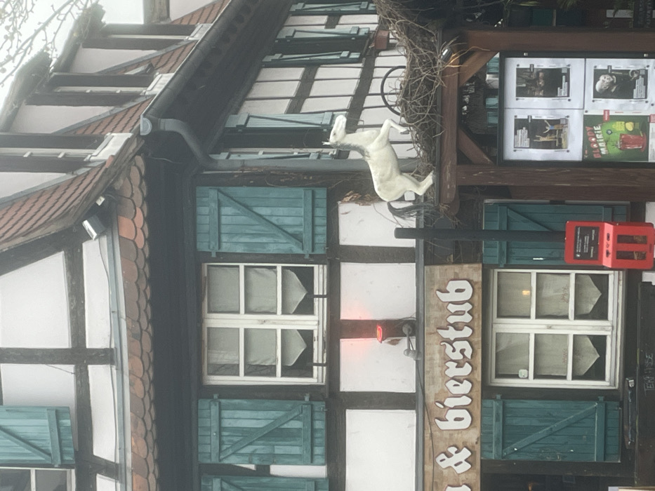 The image captures the exterior of a three-story, half-timbered building in Schiltigheim, France, under an overcast sky. The structure features white plaster infill sections delineated by dark brown wooden beams and possesses a gabled roof constructed with terracotta-colored tiles, which includes several visible dormer windows. A grey downspout descends vertically on the right side of the building's facade. Multiple white-framed windows with teal-colored wooden shutters, some open and some closed, are present across all visible levels; lower panes of several windows display white café-style curtains. Above the ground floor, a prominent dark sign with white sans-serif lettering reads "& bierstub." Below a second-story window, a red floodlight or similar illumination device is affixed to the building. To the right of what appears to be a building entrance area, a white statue of a rearing horse with a dark mane and tail is positioned atop a nest-like thicket of intertwined branches. This sculptural arrangement rests above a tall, dark wooden display post showcasing several printed posters, one of which prominently displays the word "MAIRIE" and another refers to "Bloody Mairie." Immediately to the left of the display post, a red, multi-compartment wall-mounted object, possibly a dispenser, is attached to a black vertical pole. A partially visible sign below a ground-floor window reads "TERRASSE." No individuals are visible within the frame.