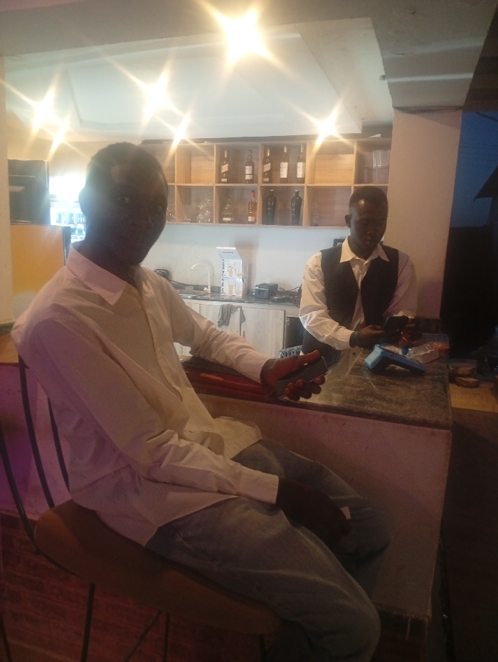 The image depicts an indoor scene within an establishment in Gura Top, Nigeria, featuring a bar area under dim ambient lighting with bright overhead fixtures