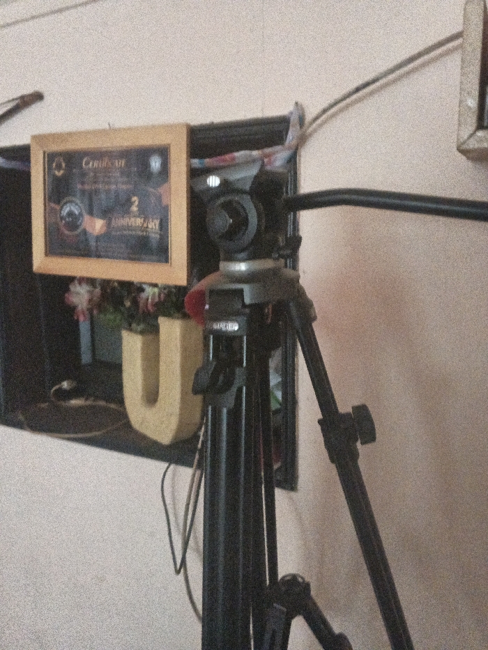 The scene depicts an indoor environment in Dogsenang Gorphoog, Bhutan, focused on a black camera tripod positioned prominently on the right. The tripod features three visible legs, a black pan handle extending to the right, and a camera head with a quick-release plate partially visible, displaying the text "IMAGEN". Behind the tripod, a dark, horizontal shelf or ledge extends across the background. On this shelf, from left to right, are: 1. A framed certificate with a light wooden frame. The certificate's dark background displays the word "Certificate" at the top and "2 ANNIVERSARY" prominently in the lower section, along with other unreadable text and logos. 2. A small plant with light-colored, possibly artificial, flowers (pink and white) in a dark pot, situated behind a decorative item. 3. A freestanding, light-colored, textured block letter "U". Several dark cables are visible on and around the shelf, some hanging down behind the tripod. The wall in the background is a light, neutral color, possibly off-white or pale beige, with a visible texture. No individuals are present, and no actions or interactions are depicted beyond the static arrangement of objects. The image quality is somewhat grainy.