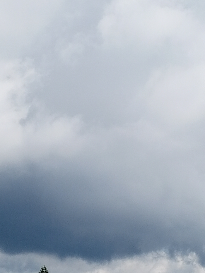 The image predominantly features a cloudy sky, with varying shades of gray. The lower portion of the image showcases darker, more ominous clouds, while the upper part displays lighter, whiter clouds. A small evergreen tree is visible at the very bottom edge of the frame. The overall composition suggests a potentially stormy or overcast weather condition.
