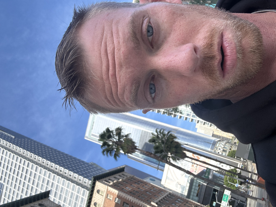 A selfie of a fair-skinned man with blue eyes and light facial hair is framed against a cityscape with tall buildings. He wears a dark hooded garment. Skyscrapers, palm trees, and street signs fill the background, bathed in daylight under a clear, blue sky.