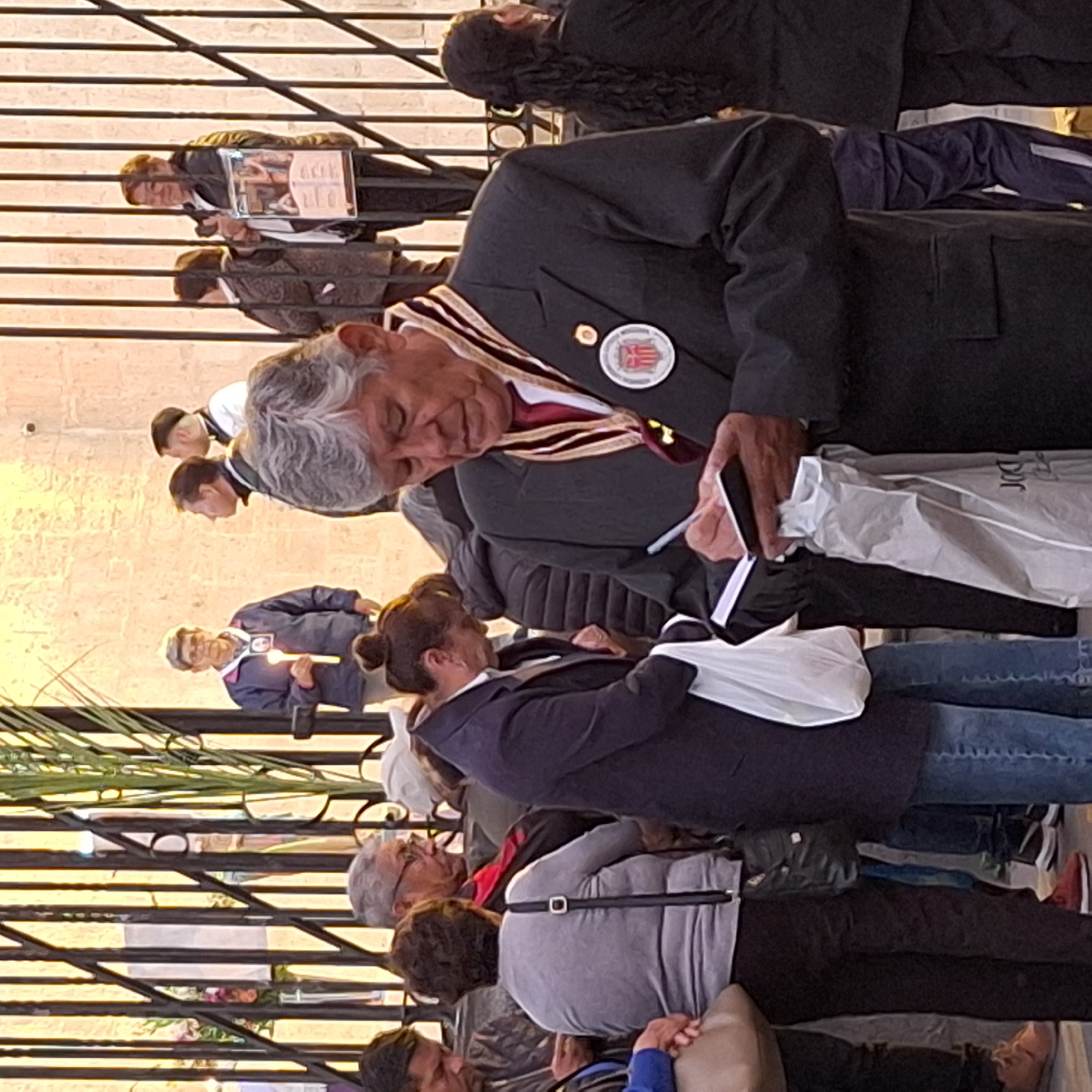 A medium shot captures a group of people in Arequipa, Peru. In the foreground, an older man wearing a suit, a striped sash, and a circular badge is signing a piece of paper held over a white plastic bag. A woman with a bun, wearing a blue jacket and jeans, stands beside him, partially obscuring his view. Other individuals are visible behind them, including a person in a gray sweater with a strap across their back. Further back, more people are seen, some holding framed images. A black metal fence runs across the lower left of the frame, with green foliage visible behind it. The background shows a light tan wall.