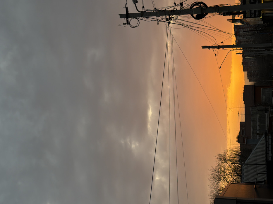 The image displays an urban street scene at either dawn or dusk in Rostov-on-Don, Russia. The sky occupies approximately two-thirds of the frame, characterized by dark grey, overcast clouds in the upper portion, which transition to a prominent orange and yellow glow at the horizon. In the left foreground, a dark-colored building facade with horizontal paneling is partially visible, alongside the corrugated metal roof of an adjacent structure. Bare tree branches, silhouetted against the bright sky, extend from the left side of the frame. Multiple utility wires traverse the mid-ground horizontally across the scene. The right foreground features a heavily instrumented utility pole, likely concrete or metal, laden with a dense array of black electrical and communication cables, some coiled. A street lamp is affixed to this pole. Immediately to its right, a dark sign is partially visible, containing indistinct Cyrillic script and some Latin characters, including "ODDEN" and "BRUS." Another, smaller utility pole is situated further left in the mid-ground, also supporting wires and a street light. The background reveals the dark silhouettes of numerous multi-story urban buildings against the brightly illuminated horizon. No individuals are visible, and no specific actions or interactions are depicted. The environment is distinctly urban, characterized by dense utility infrastructure and residential or commercial architecture.