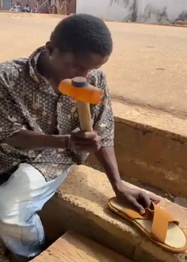 A man is shown crafting footwear outdoors. He is sitting on a concrete ledge, working on a tan sandal with a cross-strap design. He is using a small orange hammer to secure the strap to the sole of the sandal. The man wears a printed shirt and light-colored pants. A motorcycle with multiple passengers passes in the background, and a white building with barred windows is also visible. The ground appears to be reddish-brown. The man is focused on his work, carefully positioning the hammer and striking the sandal.