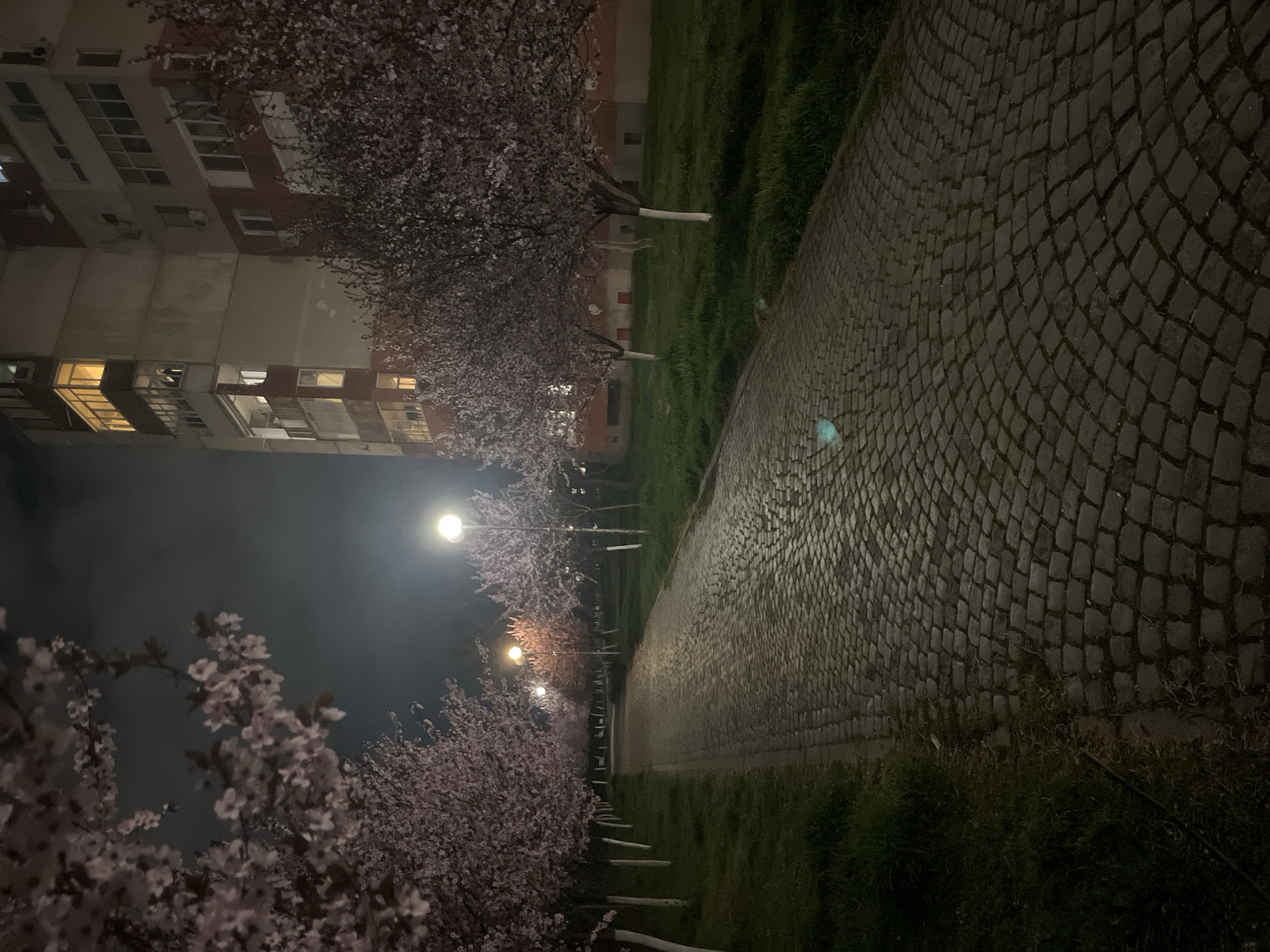 The image presents a night scene in Plovdiv, Bulgaria. A cobblestone walkway stretches into the distance, lined with blossoming trees, likely cherry trees given the pinkish-white flowers. Streetlights illuminate the path and the trees, casting a glow on the blossoms. A multi-story building is visible on the left side of the walkway. The scene is quiet and devoid of people. The atmosphere is calm and serene, characteristic of a spring night.