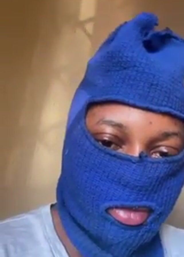 A person wearing a blue knitted balaclava mask with holes for the eyes, nose, and mouth is centered in the frame
