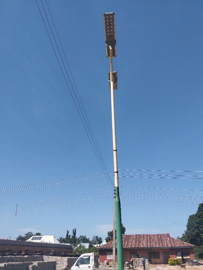 This image depicts a daytime scene in Unguwan Rimi, Nigeria. A prominent, tall street light pole with a green lower section and a light beige upper section stands centrally. Two dark-colored, rectangular solar-powered LED street lights are mounted on the upper part of the pole. Multiple thin, dark power lines traverse horizontally across the upper-left sky. The sky is clear and bright blue. In the middle ground and background, various elements are visible. To the left, numerous stacks of gray concrete blocks are piled, with a white commercial vehicle partially visible behind them. Further left, a building with a light-colored, possibly pyramidal roof featuring solar panels is partially discernible. In the lower right, a single-story building with reddish-brown walls and a corrugated red metal roof is visible. Two individuals are positioned near this building, appearing to be interacting with materials or standing near the construction site. One person is wearing a blue shirt. Scattered trees and vegetation are present in the background, particularly on the right side. The overall scene suggests an urban or semi-urban environment with ongoing development or construction activities.