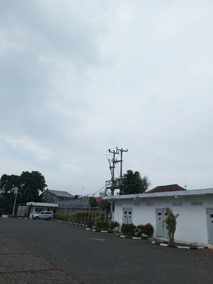 This image depicts an outdoor environment in Cianjur, Indonesia, under an overcast sky. The foreground consists of a paved surface, segmented into a darker asphalt-like area and a lighter section of reddish-brown interlocking pavers to the left. On the right, a single-story white building features at least three gray doors with small rectangular vents above them, separated from the paved area by a low curb adorned with small, manicured bushes and plants. In the mid-ground, a silver sport utility vehicle (SUV) is parked on the darker paved surface to the left. Behind the vehicle and extending across the scene, a concrete wall separates the foreground elements from a cluster of buildings with varying roof styles, including flat and reddish-brown tiled roofs. A tall wooden utility pole, equipped with multiple crossarms, insulators, and a transformer assembly, stands prominently in the center-right of the mid-ground, with numerous power lines extending from it. Dense green foliage from trees and bushes is visible on the far left and around the utility pole. No individuals are present in the scene, and no specific actions or interactions are occurring.