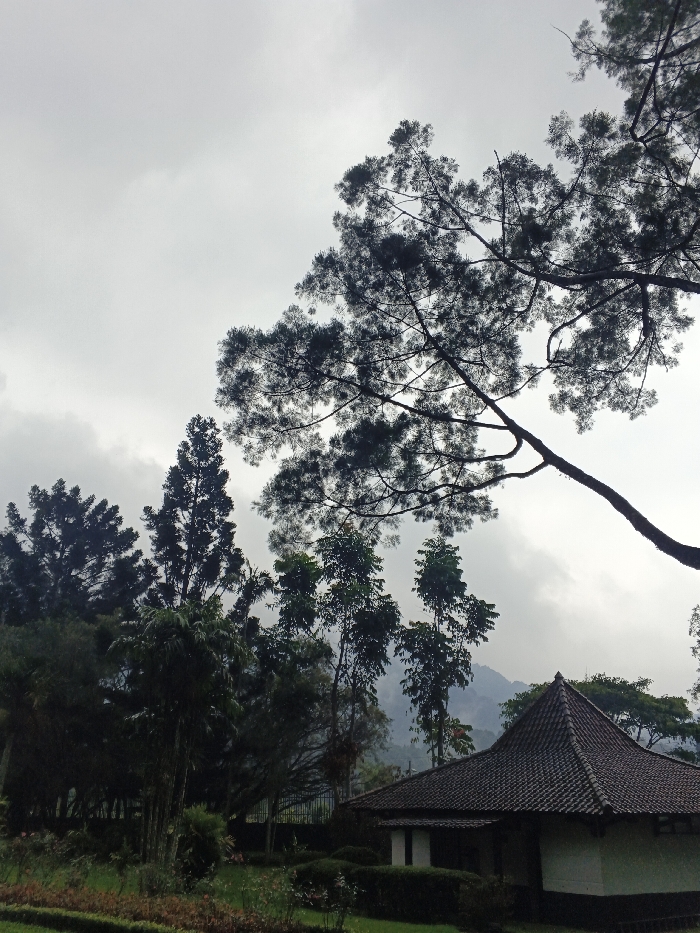 The scene captures a tranquil, overcast day. Silhouetted trees dominate the upper portion of the image, their branches reaching towards the cloudy sky. A building with a dark tiled roof sits nestled amidst lush greenery and hedges. Mountains are subtly visible in the distance, shrouded in mist, adding depth to the landscape. The overall tone is peaceful and somewhat muted, emphasizing the natural beauty of the surroundings.