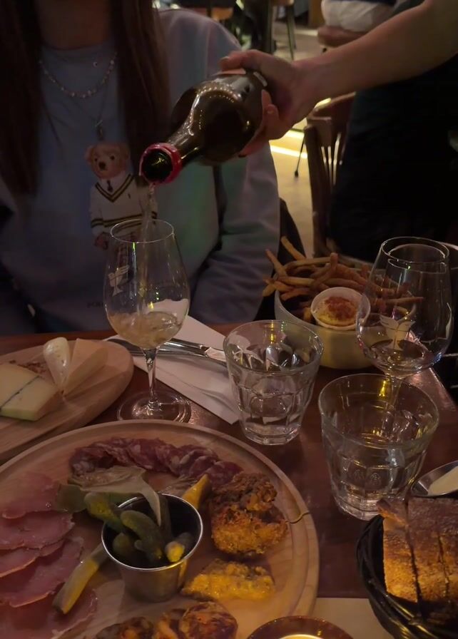 The scene shows a restaurant table with a woman in a light blue sweatshirt sitting at it, while another person is pouring a light-colored beverage from a dark bottle into a wine glass. The table has a charcuterie board with meats, cheeses, pickles, and fried items. There's a dish of fries with dipping sauce, bread, and multiple glasses. The lighting is warm. In the background, other patrons and staff can be seen.