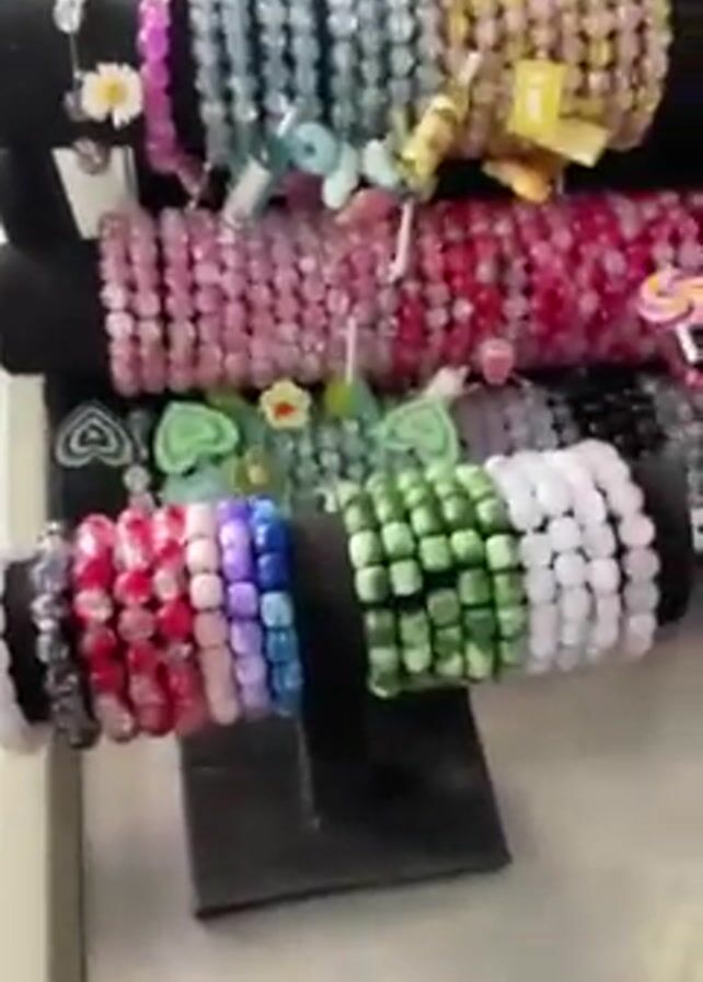 A display of multicolored beaded bracelets is showcased on a black stand. The bracelets are arranged in rows, with different colors and patterns visible. Some of the bracelets are adorned with charms such as flowers, lollipops, and miniature liquor bottles. The stand has multiple levels, allowing for the bracelets to be displayed in an organized manner. The background is blurred, suggesting that the focus is on the bracelets and the stand.