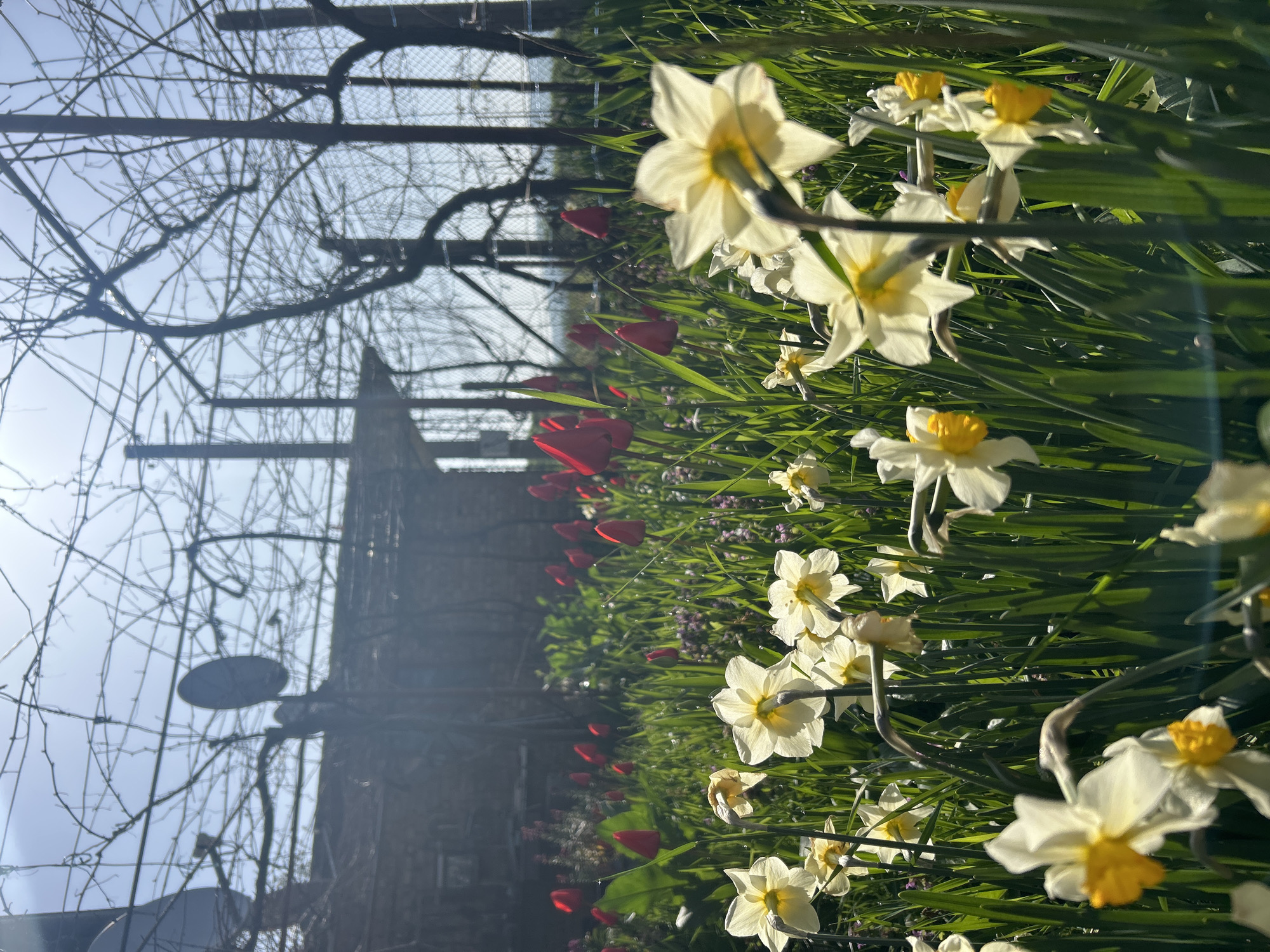 - "The image depicts a ground-level view of daffodils and red tulips in a garden setting" by FM-q38rg2, licensed under CC BY 4.0