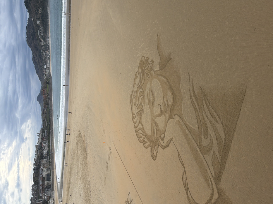 This image depicts La Concha Beach in San Sebastián, Spain, under an overcast sky. The foreground is dominated by a large, intricately drawn sand art portrait of a classical-style bust, featuring a figure with closed eyes, resting its head on one hand. The drawing is rendered with subtle shading within the light brown sand. To the left and slightly behind this main artwork, faint, less distinct lines and partial sand markings are visible. The expansive sandy beach stretches into the midground, where several small, distant human figures are scattered, walking or standing near the waterline. The Cantabrian Sea occupies the background, displaying gentle waves breaking onto the shore. Beyond the water, the city of San Sebastián rises, with numerous buildings clustered along the coastline and verdant hills ascending into the distance beneath a grey, cloudy sky.