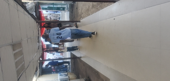 The image depicts a covered pedestrian walkway in Falomo, Nigeria