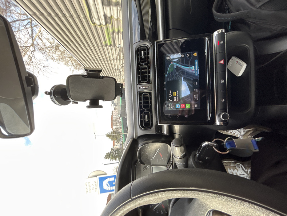 The image depicts the interior of a vehicle from a first-person perspective, looking forward, captured during daytime in Saint-Étienne, France