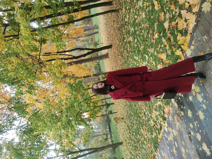 A full-length outdoor photograph depicts a young adult female standing on a paved pathway within a park in Kyiv, Ukraine, during autumn. The woman has dark, shoulder-length hair, wears red lipstick, and is dressed in a long, dark red double-breasted wool coat, extending to mid-calf. A black top is visible beneath the coat's lapels, which feature a gold-toned, ornate brooch pinned to the left side. She holds a black, structured handbag with a gold-colored chain handle in her left hand. She wears black, pointed-toe, knee-high boots. Her head is slightly turned towards the left, while her body is oriented slightly to the right with her left foot advanced. The foreground features a paved path composed of interlocking grey and charcoal rectangular tiles, partially covered with fallen yellow and orange leaves. The surrounding ground is a mix of green grass and a dense layer of fallen yellow and orange deciduous leaves. The background consists of numerous deciduous trees exhibiting a blend of green and yellow foliage, characteristic of autumn. The lighting is diffused, suggesting an overcast sky.