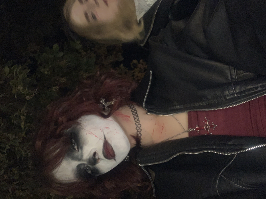 This image depicts two individuals outdoors at night. The foreground subject, positioned on the left, is a person with reddish-brown, wavy hair. This individual's face is covered in elaborate makeup, including a white base, dark contouring around the eyes and nose, dark red lipstick, and red streaks resembling blood on the left cheek and neck. They are wearing a black faux leather jacket with a partially open zipper, a dark red top underneath, a black lace choker, a silver-colored cross earring on the right ear, and a silver-colored chain necklace with a red jeweled cross pendant. This individual looks directly at the camera with a neutral expression. The second individual, partially visible and blurred on the right side of the frame, has blonde, medium-length hair and is wearing a light-colored top, possibly a gray sweatshirt. This person's face is out of focus and appears to be looking slightly away from the camera. The background consists of dark, blurred foliage, indicating an outdoor, nighttime setting. The precise location within Budva, Montenegro, cannot be determined from the visual information presented.
