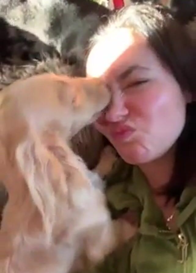 woman lying down, wearing a green hoodie. A beige, long-haired dog is licking her face repeatedly. Another, black dog is partially visible behind the woman. The woman is grimacing and closing her eyes as the dog licks her. The background features fuzzy brown material, and a few decorative plants are visible in the upper left corner.