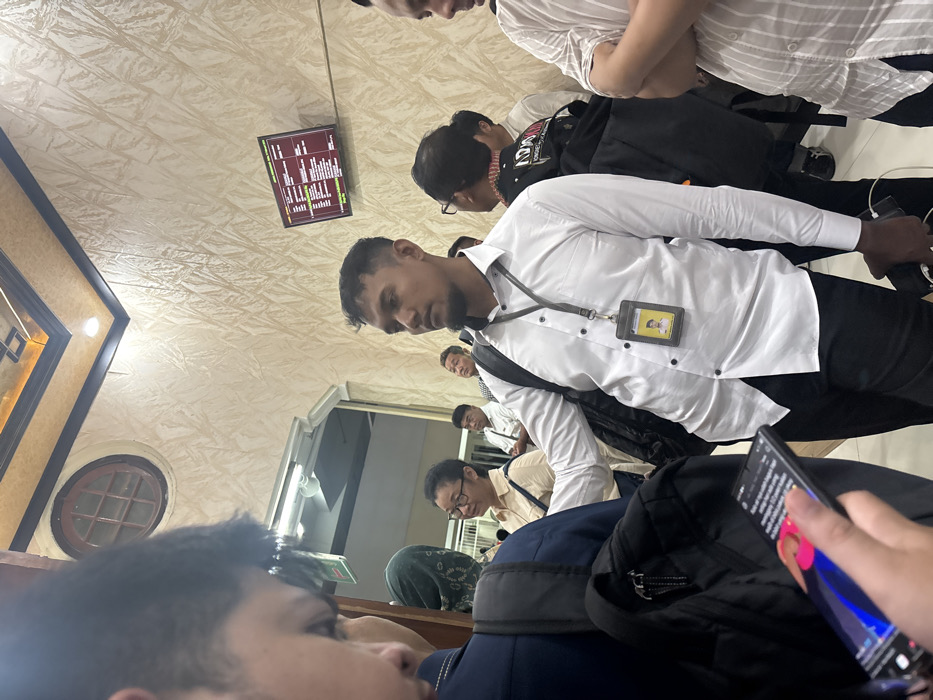 An indoor scene depicts several people, mostly men, casually dressed, some with bags or backpacks. One man in a white shirt and black pants wears an ID badge. A person holds a mobile phone displaying content. A monitor showing information hangs on the textured wall. The overall perspective is slightly tilted, capturing a waiting area or a public space.