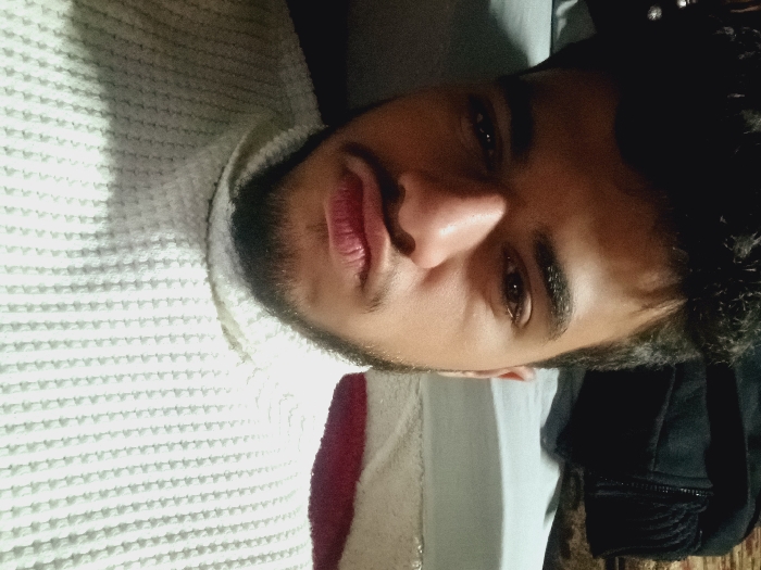 A young man with brown eyes, dark hair, and a trimmed beard poses in a close-up, tilted view