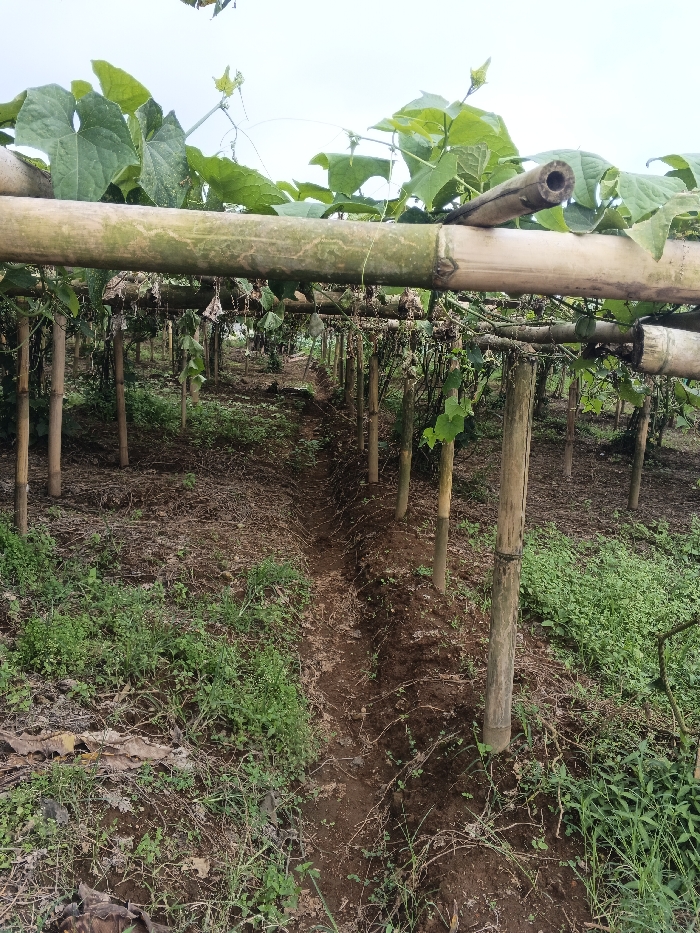 An agricultural scene in Maw Hit, Myanmar, depicts a bamboo trellis system supporting climbing vines