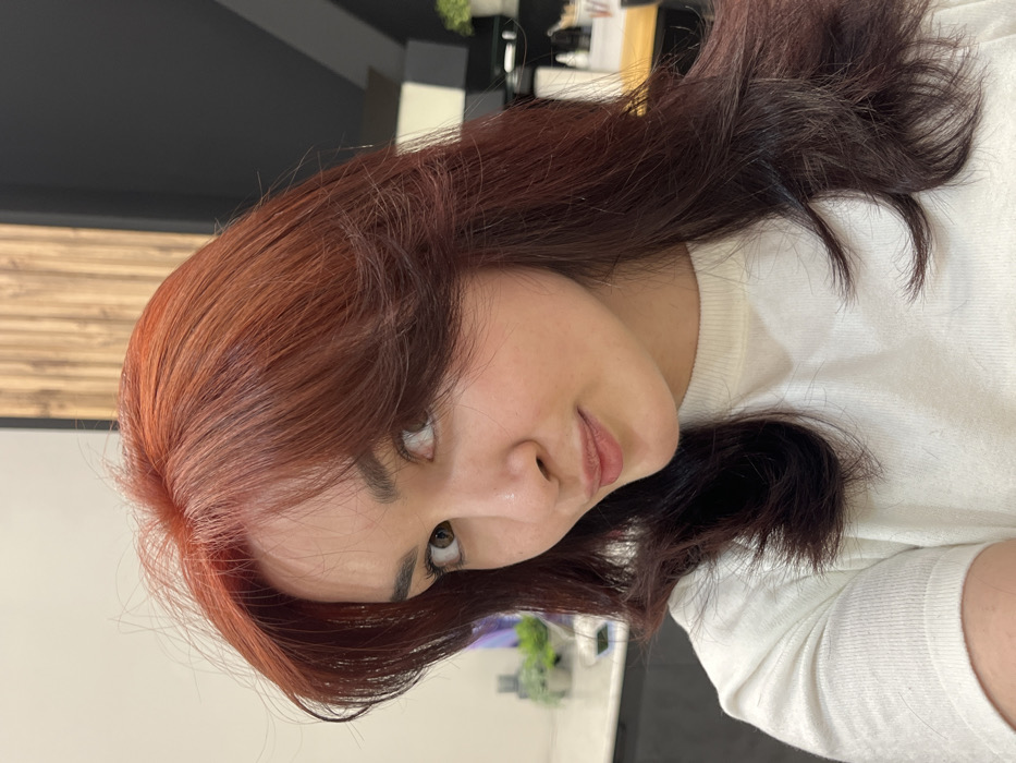 A close-up, indoor portrait features a female individual, located in the city of Neftekamsk, Russia. The subject has reddish-brown, layered hair with a distinct, lighter reddish color at the roots, and a side part. She wears a light-colored, crew-neck t-shirt. Her head is slightly turned, and she looks towards the camera with a subtle smirk or soft smile. The background is blurred, revealing a contemporary interior environment. To the left, a light-colored countertop holds indistinct objects, including small potted plants. To the right, a dark wall section with vertical wooden panels and another small potted plant are visible.