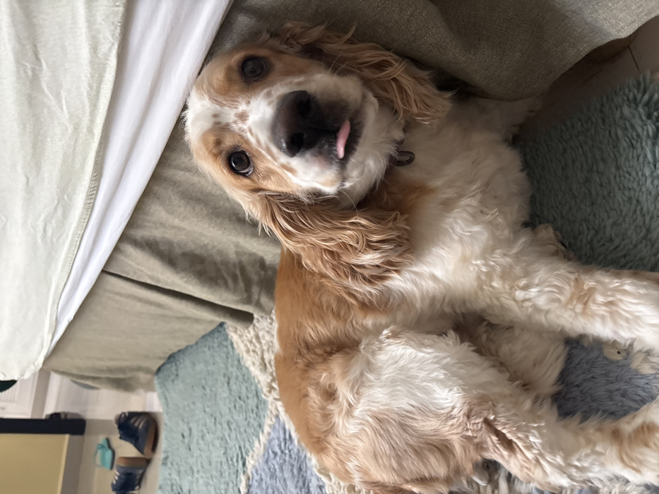 - "A tan and white Cocker Spaniel lies on its back, tongue playfully sticking out" by FM-20Tbw1, licensed under CC BY 4.0
