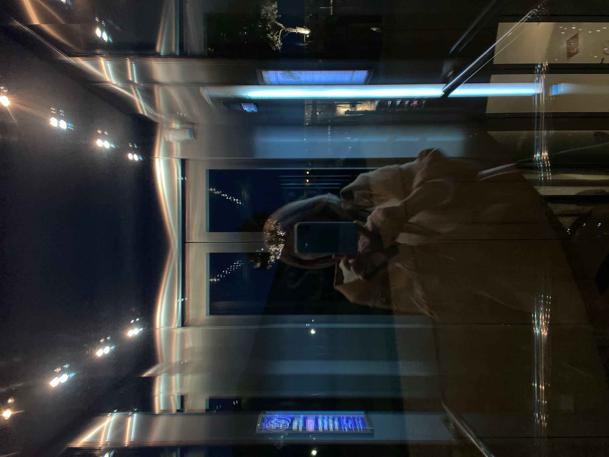 interior of a modern elevator at night. The elevator appears to be ascending or descending, with external lights visible through the windows. The reflection of a person holding a phone is visible in the elevator's mirrored walls. Reflections of the external landscape, potentially including lights along the coastline and possibly a bridge, are also visible. The presence of screens within the elevator displaying information or advertisements is also apparent. The location is suggestive of Boreti, Montenegro, given the view of a coastline at night.