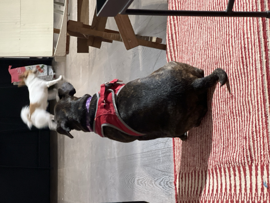 Two dogs are in the shot. A small, white and brown dog seems to be jumping around. A larger, brindle-colored dog is wearing a red harness and standing on a red and white striped rug. The background includes a wooden table, a white wall, and a black wall. The floor is light gray.