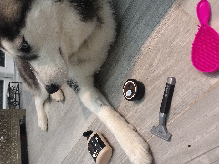 A husky with gray and white fur lies on a gray wood floor. A pink hairbrush, a black jar with a white ring, a gray deshedding tool with a black handle, and a bottle of pet shampoo are on the floor. The dog is looking down at the items near its paw.