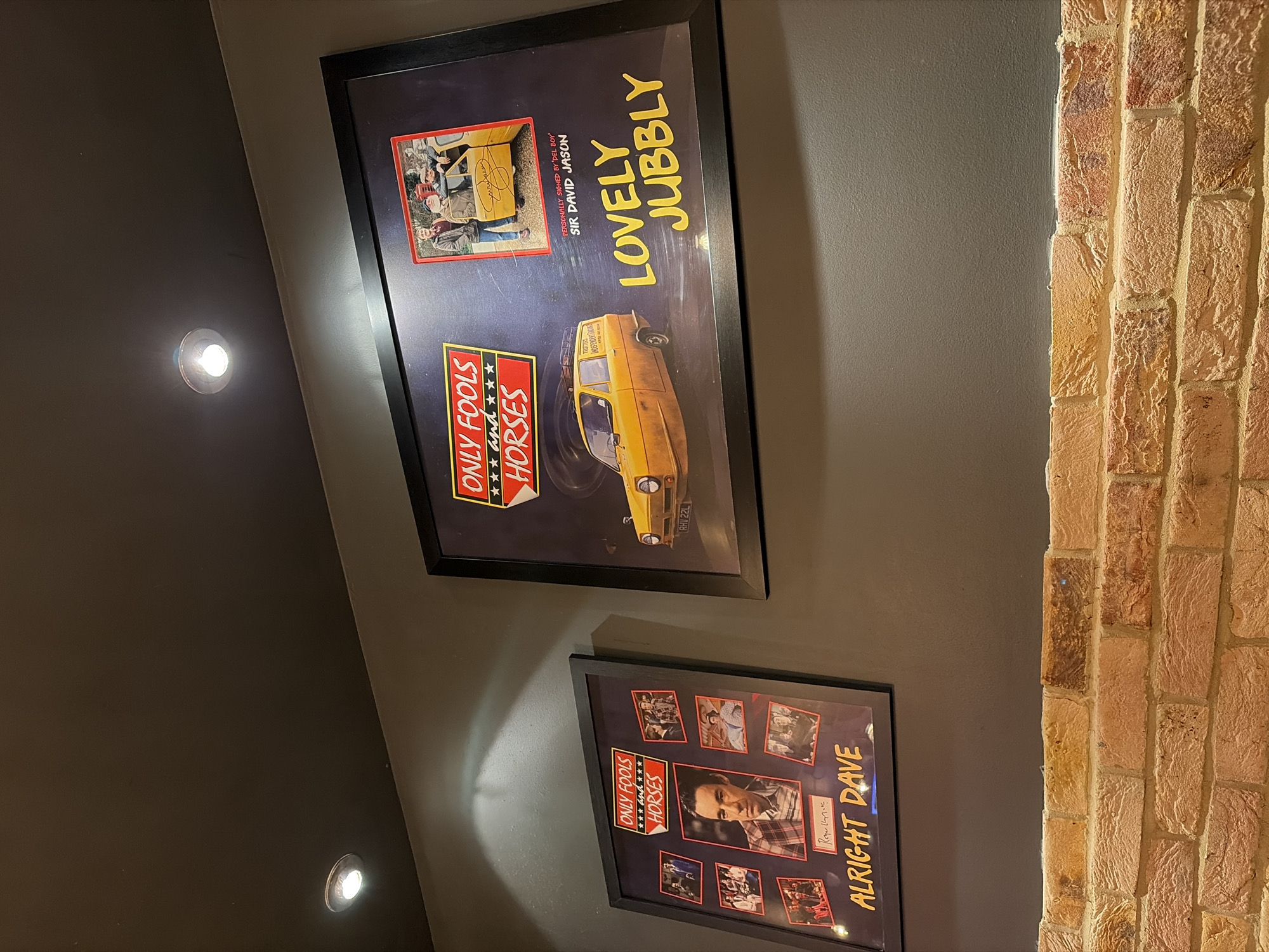 The image captures a collection of "Only Fools and Horses" memorabilia displayed on a wall with a brick accent in Ipswich, United Kingdom. The focal point is a framed poster titled "Lovely Jubbly," featuring images of the iconic yellow Reliant Regal van and an autographed picture of Del Boy, signed by Sir David Jason. Below, another framed poster titled "Alright Dave" includes images and the name "Only Fools and Horses." The wall is painted in a dark grey color, and two spotlights are located to the left of the posters. A section of brick wall runs vertically on the right side of the image.
