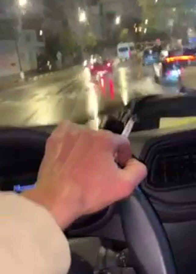 From the driver's seat perspective, the video shows a person driving in a vehicle on a wet road at night. The road is lined with streetlights and other vehicles, and the car's windshield wipers are active due to the rain. The driver's hand is visible holding a lit cigarette, with the other hand on the steering wheel. The vehicle's dashboard is visible, showing the speedometer and other gauges.